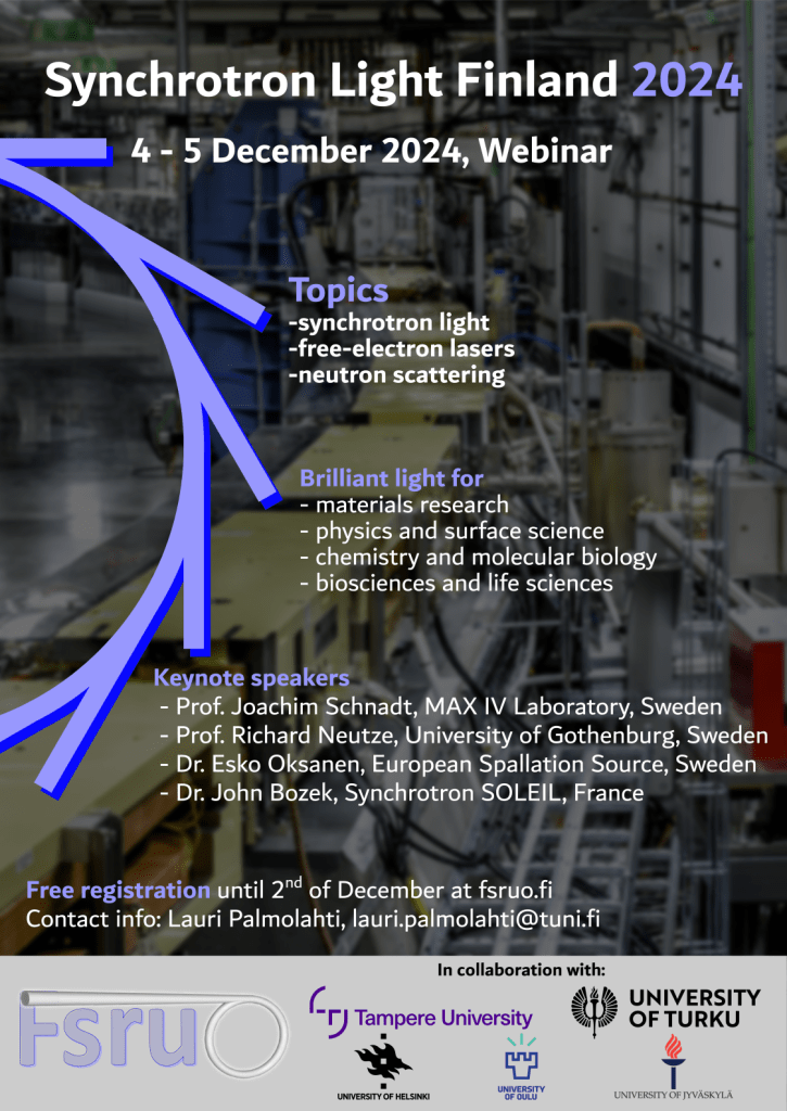 Registration to Synchrotron Light Finland 2024 is now open. The registration closes on the 2nd of Dec. The event will be free of charge and the Zoom-link to the webinar will be sent to all registered participants by email the day before the event begins. In case we need to limit the number of participants, presenters and those who registered first will have priority.